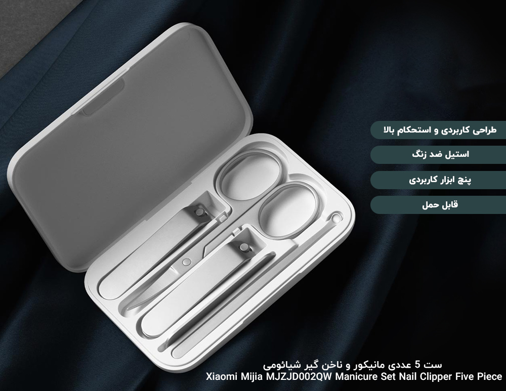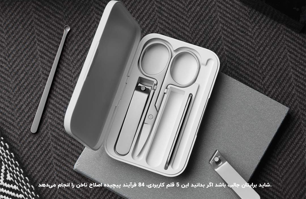 ست مانیکور میجیا شیائومی5 قلم کاربردی شامل قیچی کوچک، دو ناخنگیر، سوهان و یک قاشق گوش است که همگی جزو پرطرفدارترین و ضروری ترین ابزار آلات بهداشتی هستند. همانطورکه اشاره شده، این ست شامل دو ناخن گیر با لبه های صاف و زاویه دار است که برای اصلاح ناخن کاربرد دارد.