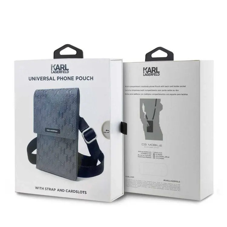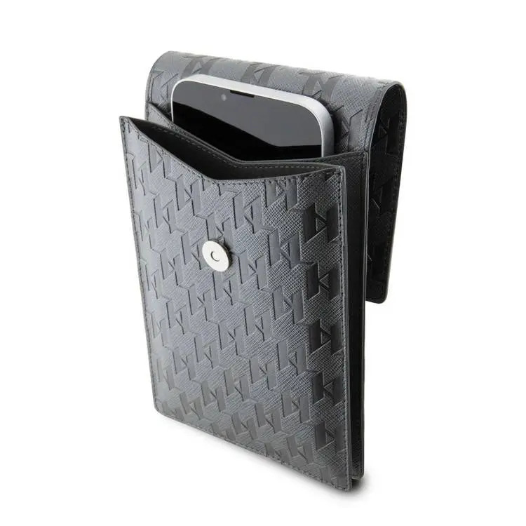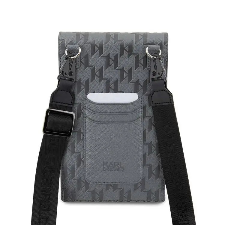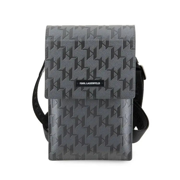 کیف تلفن صفحه ای مونوگرام کارل لاگرفلد به رنگ خاکستری و مشکی یک اکسسوری شیک و کاربردی است. با الگوی مونوگرام براق طراحی شده است و ظاهری پیچیده به استایل شما می بخشد. این کیف دارای یک بند مناسب و اسلات کارت است که به شما امکان می دهد تلفن و کارت های ضروری خود را به راحتی حمل کنید.